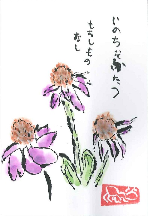 The flowers on this etegami were inspired by a daisy bush (those purple brown-eyed Susan daisies…what are they called?) that had blooms in various stages of life and death.