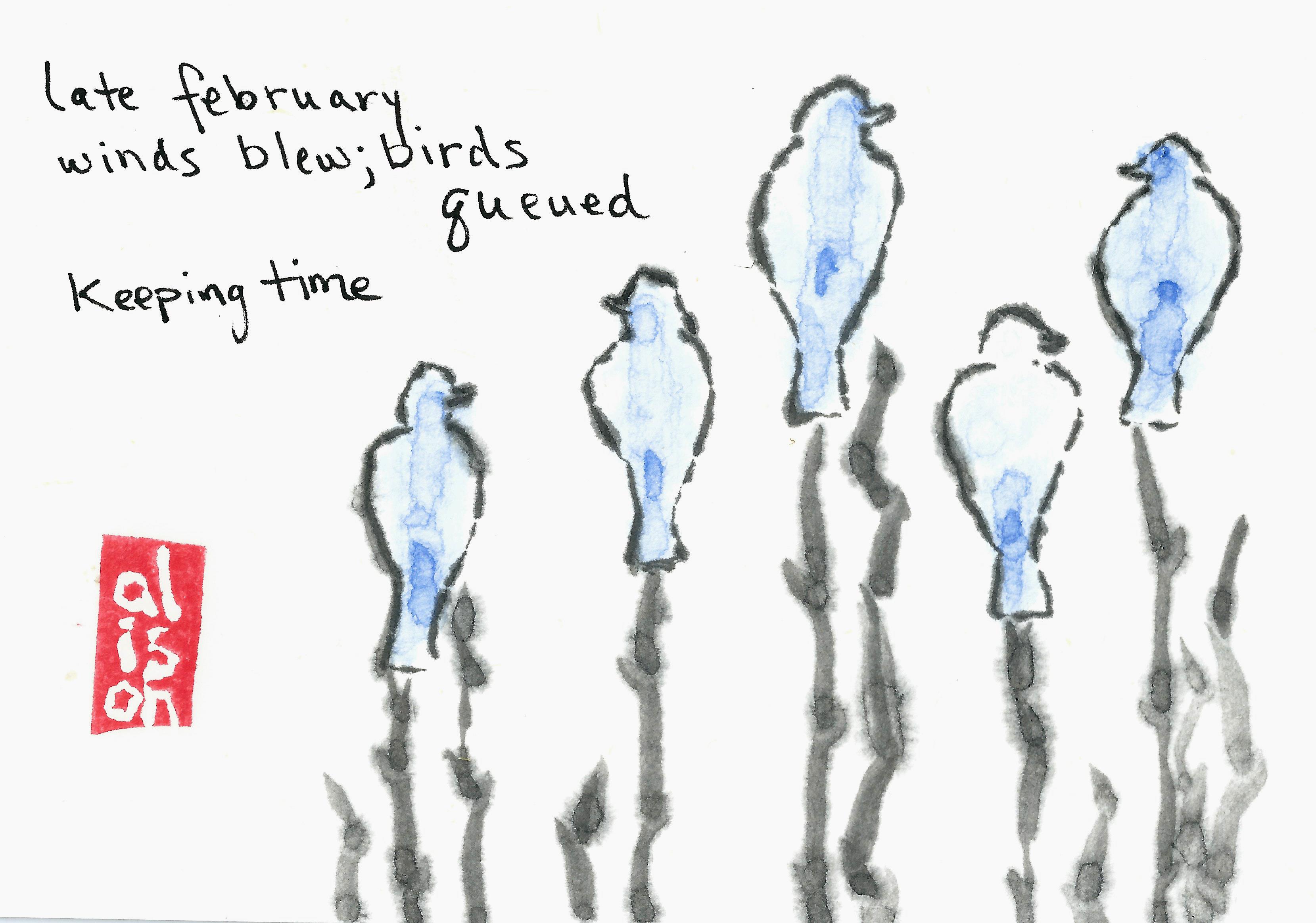 Late february winds blew; birds queued alisonMarch 10, 2013birds, haiku Post navigation PreviousNext Forgot to post this in February when I wrote the haiku and drew this etegami. Today’s balmy 60 degree weather, calm skies, feel a long way from late February. Share this: Click to share on Pinterest (Opens in new window) Pinterest Click to share on X (Opens in new window) X Click to share on Facebook (Opens in new window) Facebook Like Loading... Related