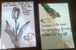 A lovely pair of etegami from Kasia in Poland. Her sumi-e tulip card features what she says is one of her first haikus! She will soon be getting a colored tulip from me!