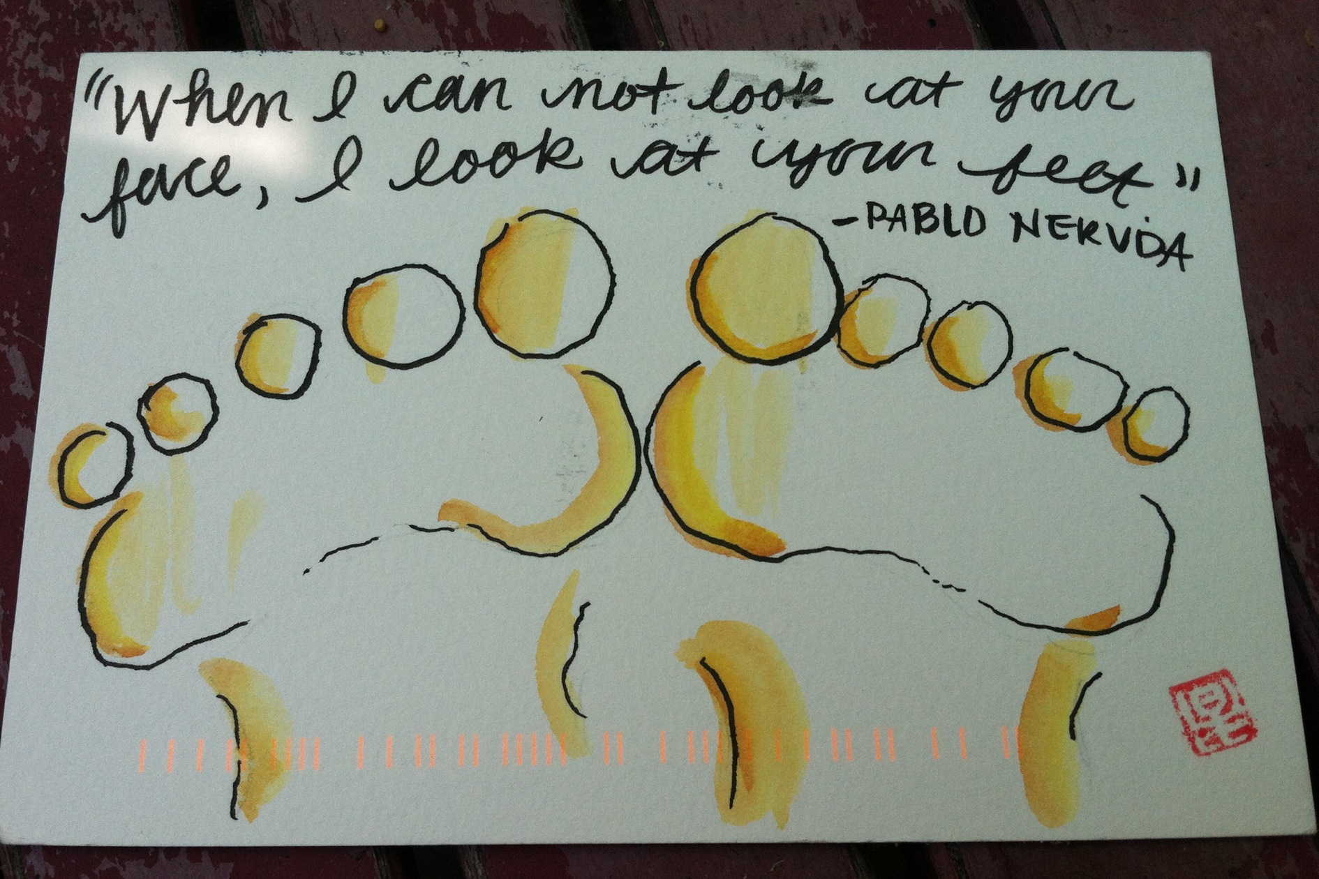 My Inbox: Footsies from Cole! alisonJune 10, 2013my inbox Post navigation PreviousNext A cute etegami of feet, with a line from Pablo Neruda “When I cannot look at your face, I look at your feet.” I wish my feet were as cute! Thanks Cole! Share this: Click to share on Pinterest (Opens in new window) Pinterest Click to share on X (Opens in new window) X Click to share on Facebook (Opens in new window) Facebook Like Loading... Related