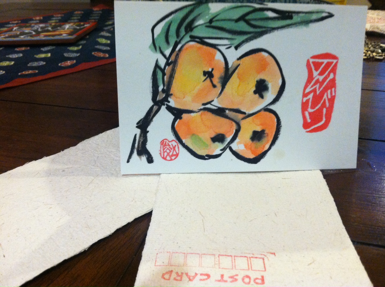 It’s always a happy day when I find an etegami in my mailbox, and it’s doubly so when the sender also gives me a couple of nice postcards so I can return the favor. Shungo from Yokohama Japan sent me these oranges (or peaches?), with the word “nonbiri” (のんびり), or carefree, stamped next to it. I love how he carved “nonbiri” in a very relaxed, easygoing manner.