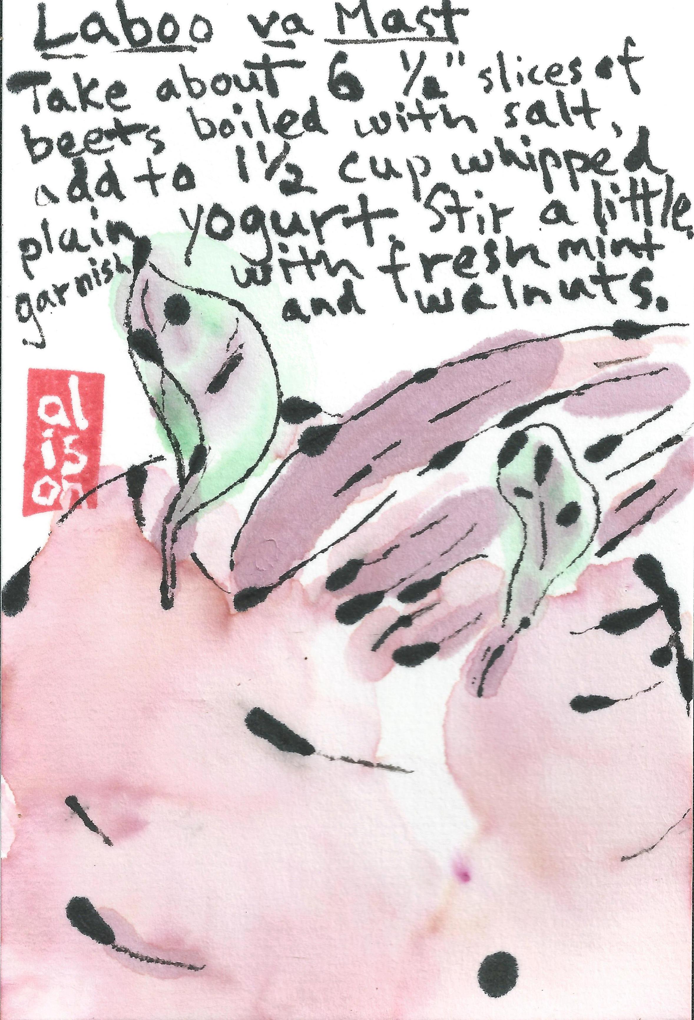 Then, after drawing the sumi lines, I got down to cooking the recipe. Well, “cooking” makes it sound like it was more work than it was. Below is my abridged recipe, enough for one person, on an etegami card. I used 2% Greek yogurt. And instead of walnuts I used pecans — it’s what I had and sprinkled the mint in before I put in the beets. Next time, to ease the mixing of the beets and the yogurt I’ll probably slice the beets into 2 inch slivers.