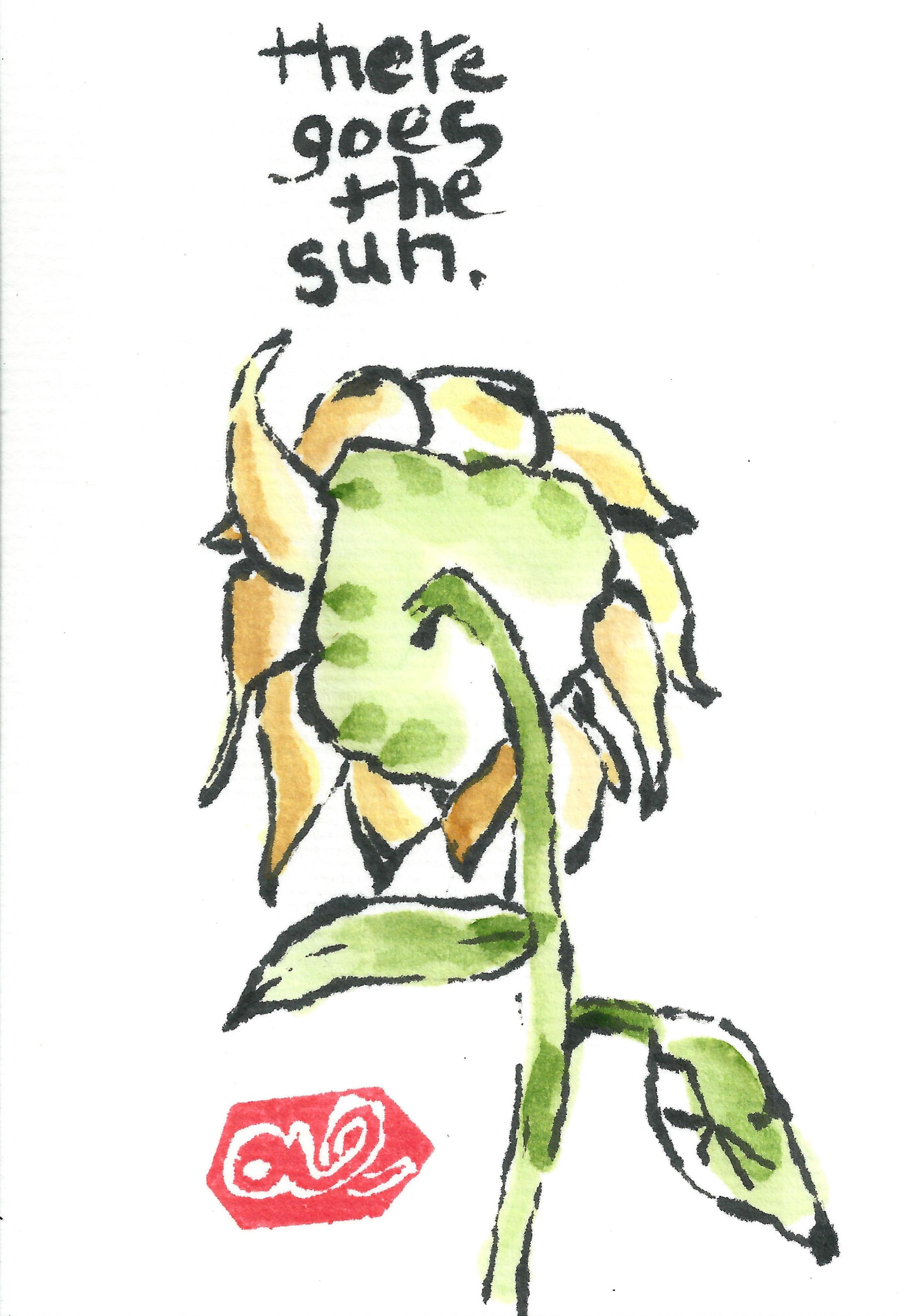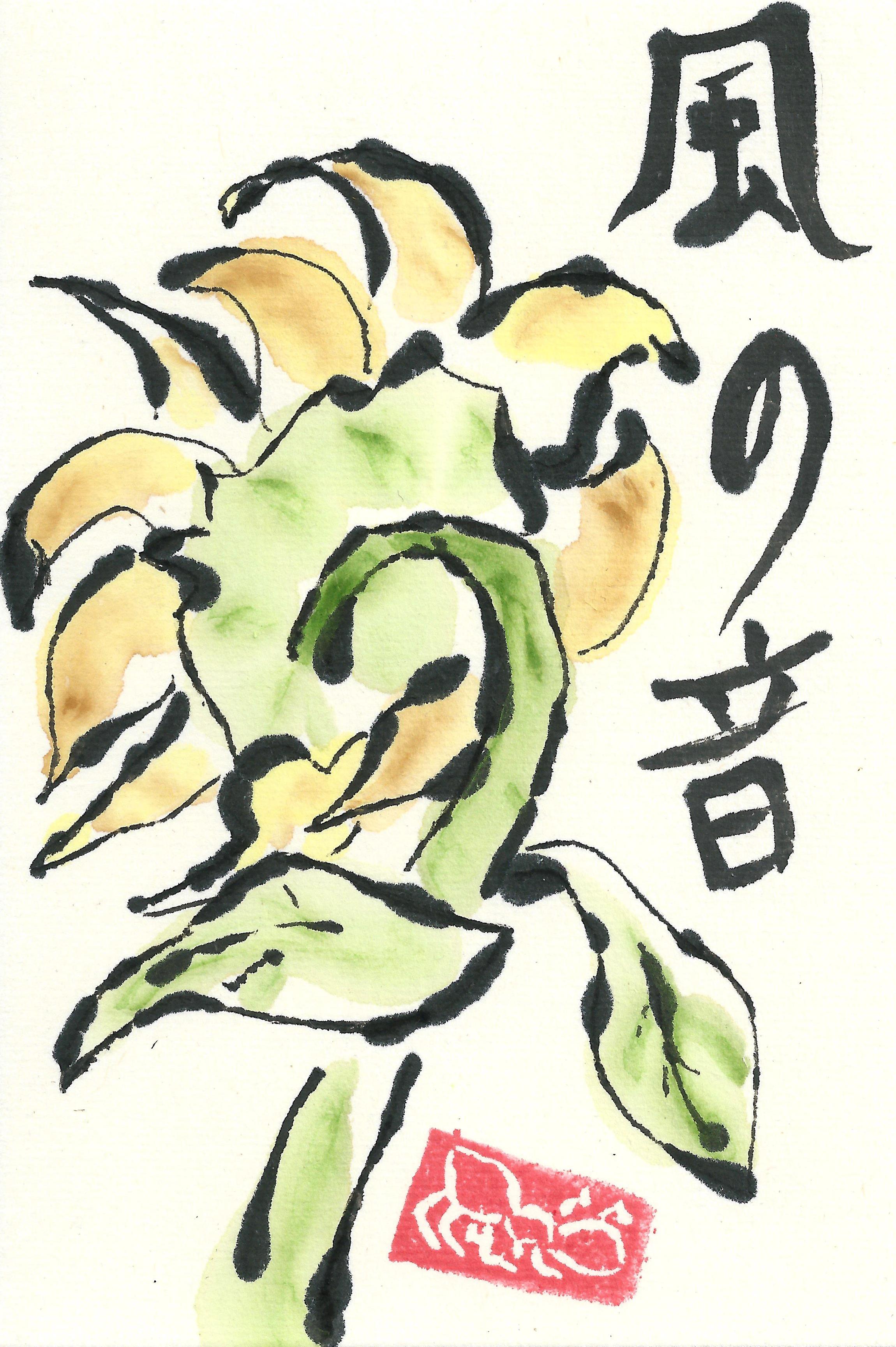 I painted a few sunflowers that I’ve seen that are sort of drooping, losing their petals, or being bowed over by the cool winds. In the first, I use the Japanese words 風の音 (kaze no oto), or “the sound of the wind.” The words I chose are inspired by a poem by Fujiwara no Toshiyuki, from the Kokinshuu, the first anthology of Japanese poetry, collected in the 10th century. Fujiwara’s poem, in English, is: “It’s a fact: autumn’s / here. To the eye it’s still not / quite apparent, but with the sound of the wind, I suddenly become aware.” (source: Oriori no Uta: Poems for all seasons, edited by Ooka Makoto, translated by Janine Beichman; Kodansha 2002)