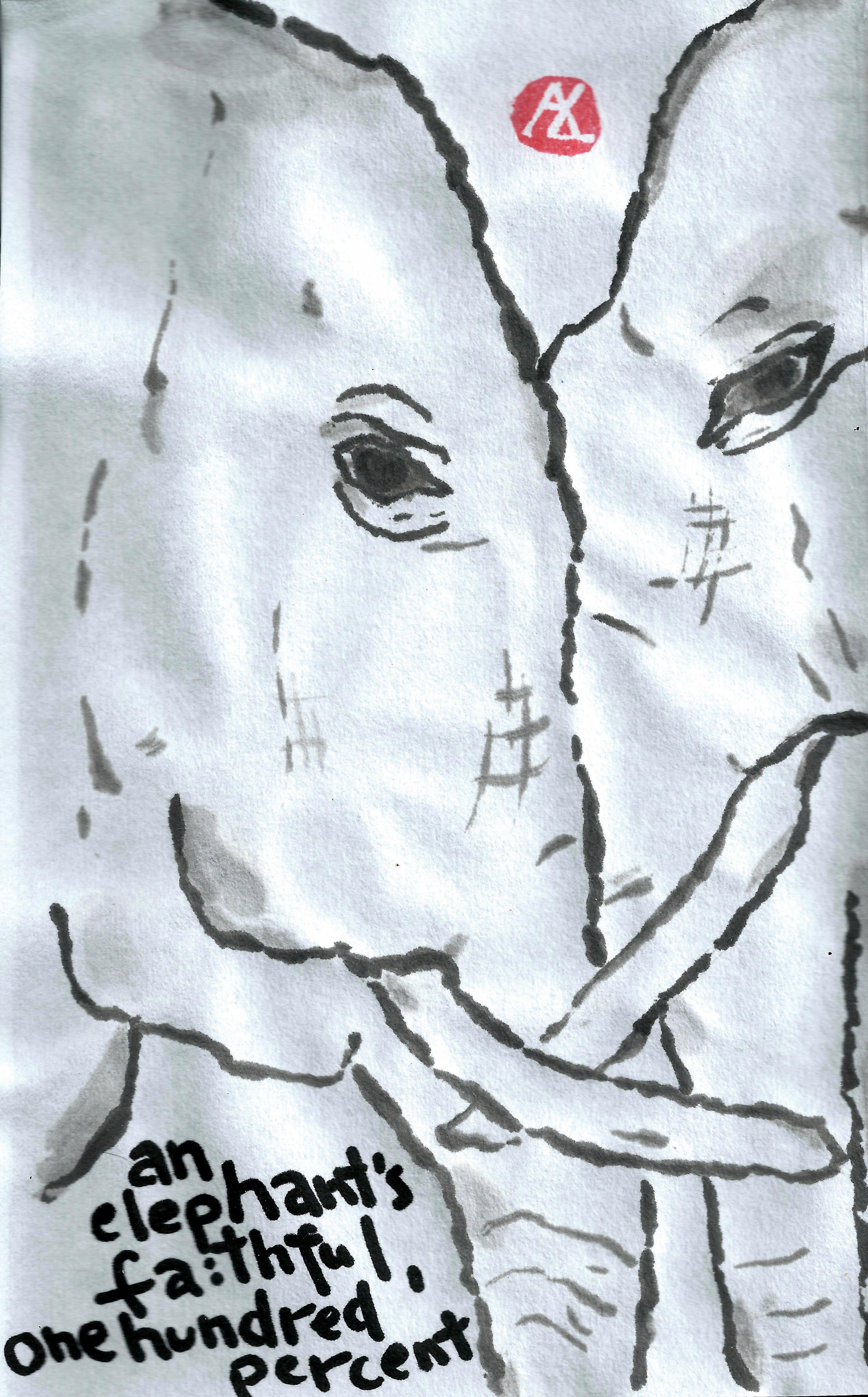 One hundred percent alisonMarch 25, 2014March 26, 2014love, poetry Post navigation PreviousNext A larger format etegami done from a series of elephant photos from Flickr, I used a quotation from Dr Seuss’s Horton Hears a Hoo: an elephant’s faithful, one hundred percent. Happy Wednesday, everyone. Share this: Click to share on Pinterest (Opens in new window) Pinterest Click to share on X (Opens in new window) X Click to share on Facebook (Opens in new window) Facebook Like Loading... Related