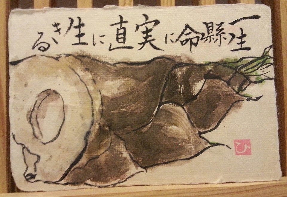 A wonderful takenoko, or bamboo shoot, which are in season right now. The words read, “Live as honestly as you can.” I will take those words to heart.