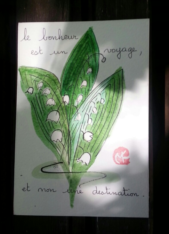 The above is from Marie in France. She translates the words as “Happiness is a journey, not a destination.” The flowers are from her garden and are called in French “porte-bonheur” — I see she did a bit of wordplay here, with the word happiness (“bonheur”).