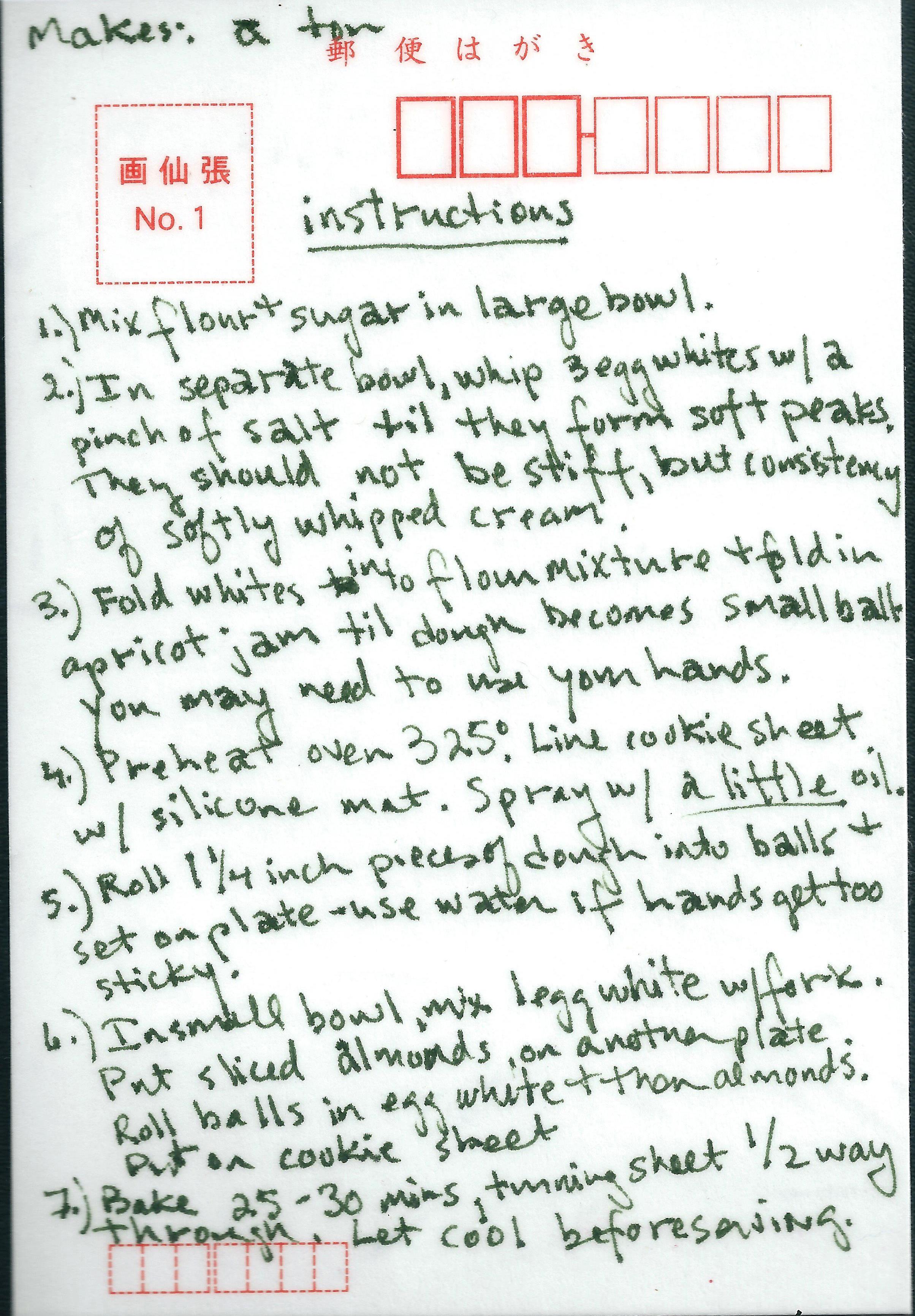 Perfect cookies! I used this recipe from David Lebovitz. The apricot jam part of the recipe is key. Oh, and of course the almond flour. AND making sure you whip the egg whites enough. I once got lazy and the cookies were too runny. We ate them anyway.
