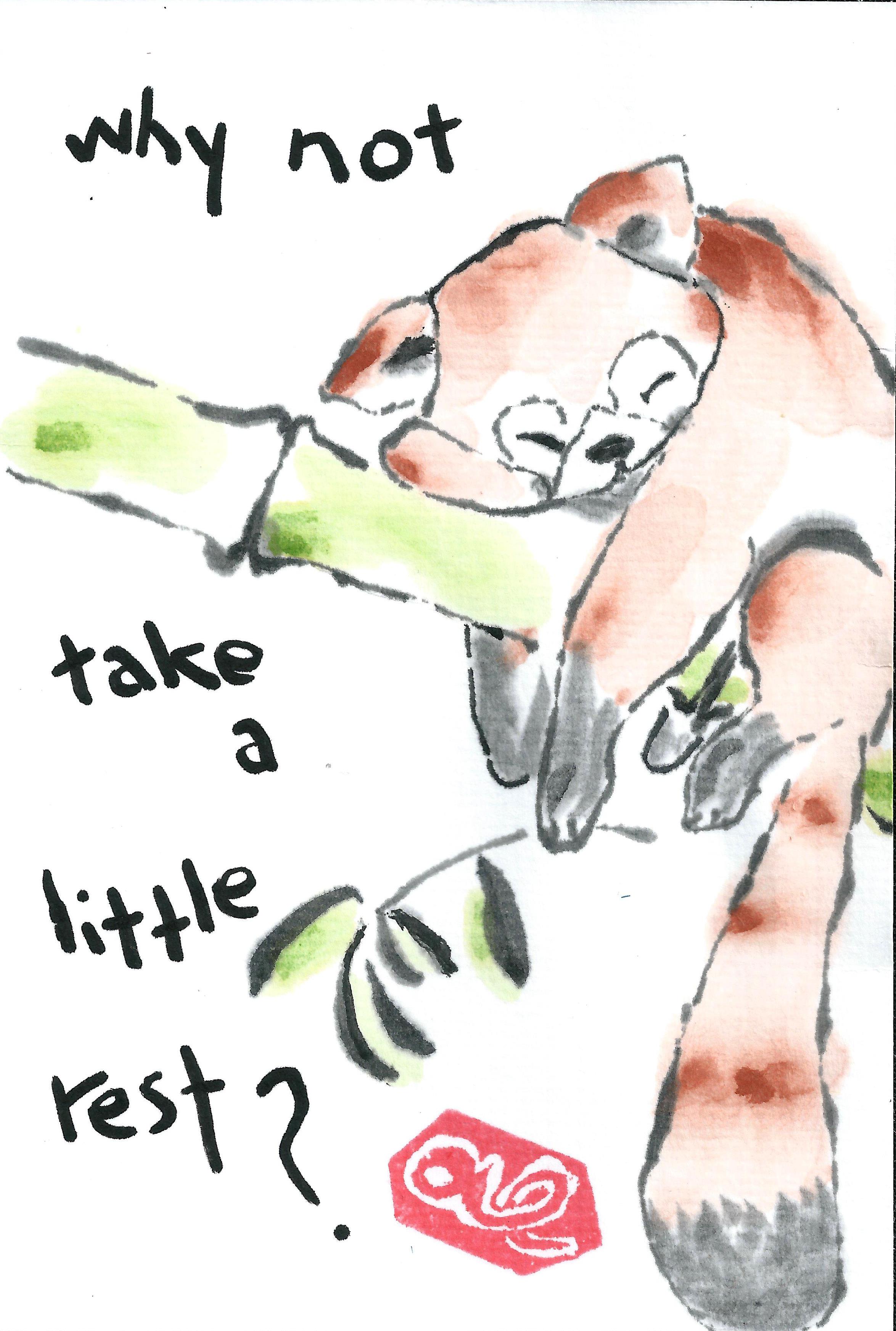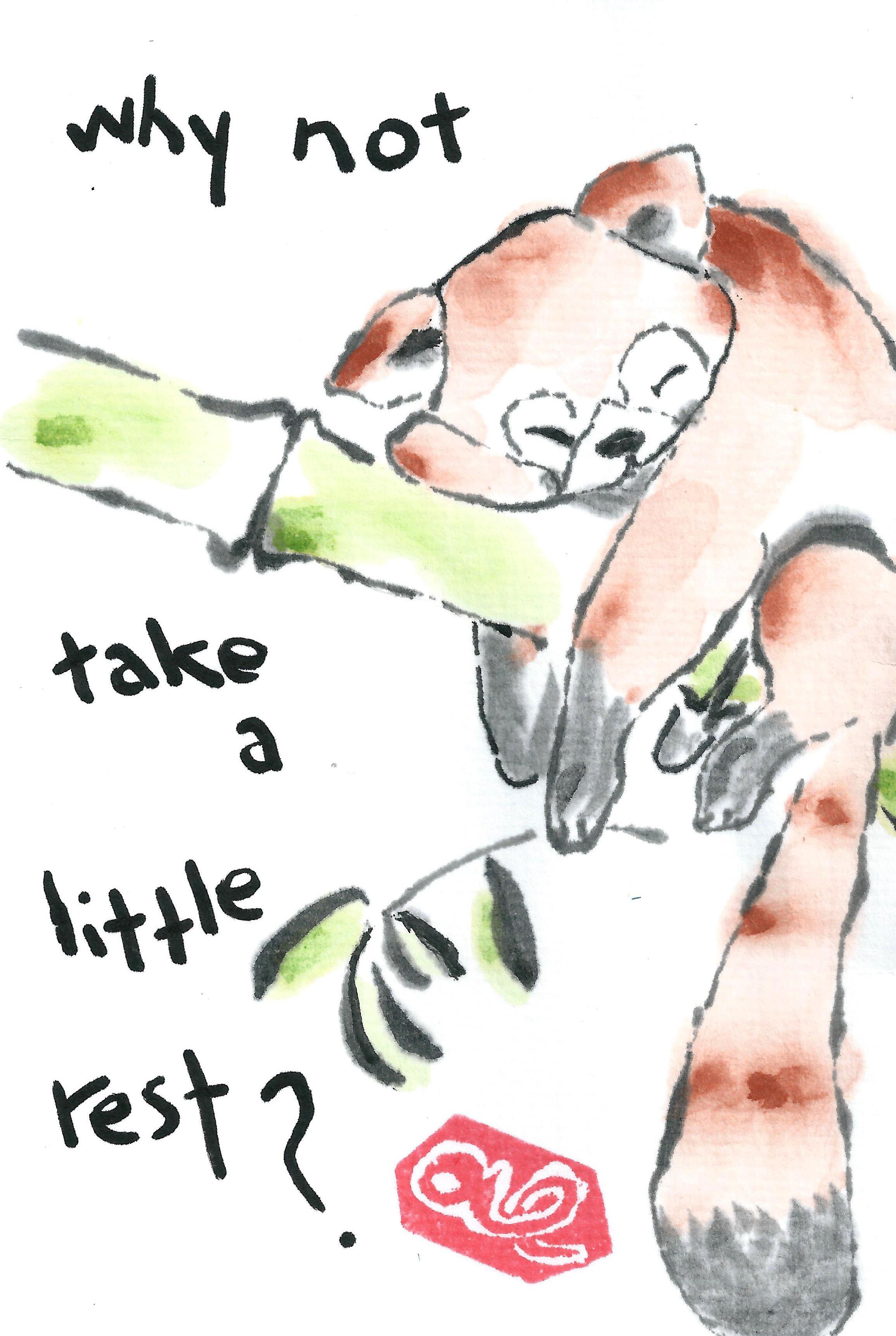 I painted this little etegami of a red panda after a visit to the US National Zoo’s Front Royal location, in Virginia, way back in October 2014. The red pandas were moved there to encourage breeding — I guess city life gets them down.