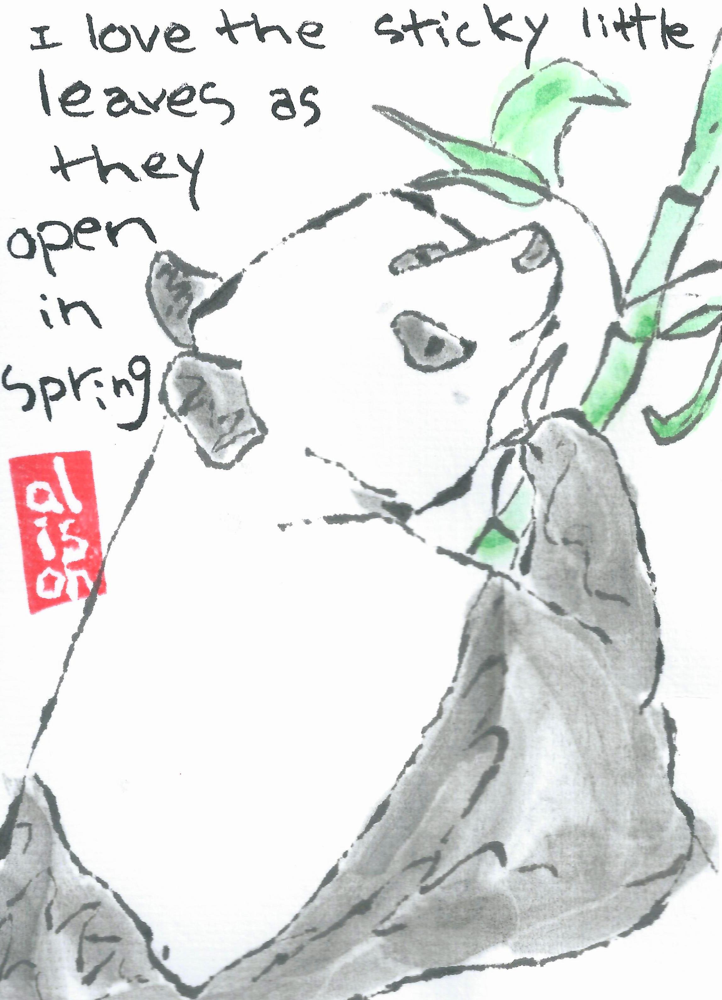 The project left me with lots and lots of extra pandas and red pandas and elephants — all bamboo eaters. I have gradually made them into etegami. Here I decorated one with an unseasonal quotation, from Dostoevsky: “I love the sticky little leaves as they open in spring.”