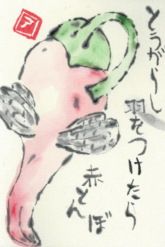 “pick one, / let’s have it for dinner” (hitotsu moide gohan ni shyou) This etegami features a curvaceous butternut … More