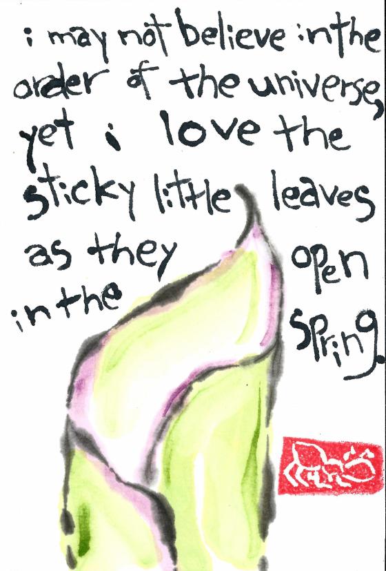 I may not believe in the order of the universe, yet I love the sticky little leaves as they open … More